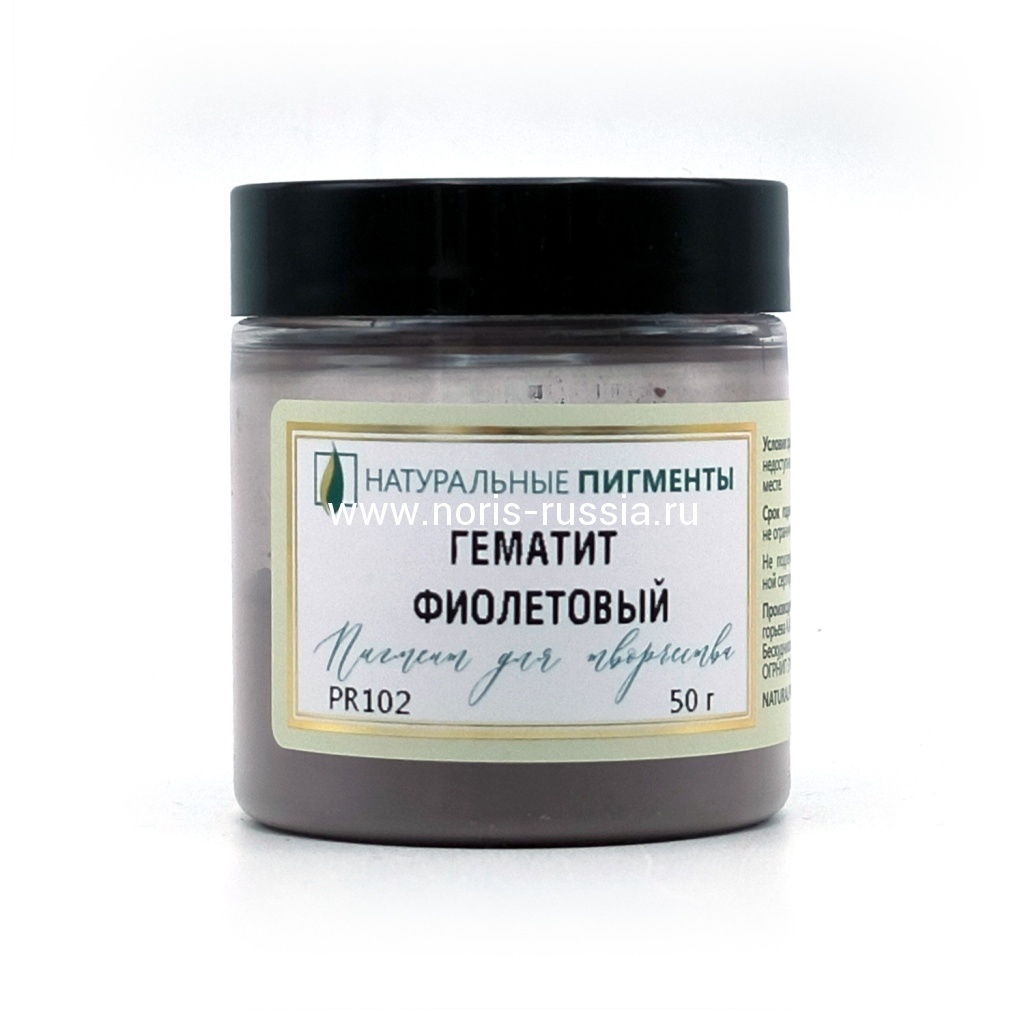 Химический состав: оксид железа, Fe2O3. Содержание железа до 70 %. Твердость по шкале Мооса 5.5-6. Минерал хрупкий. Стально-серый гематит в порошке приобретает темно-фиолетовый цвет. Благодаря металлическому блеску частиц гематита, краска на основе этого пигмента обладает эффектом блёсток на поверхности.